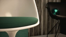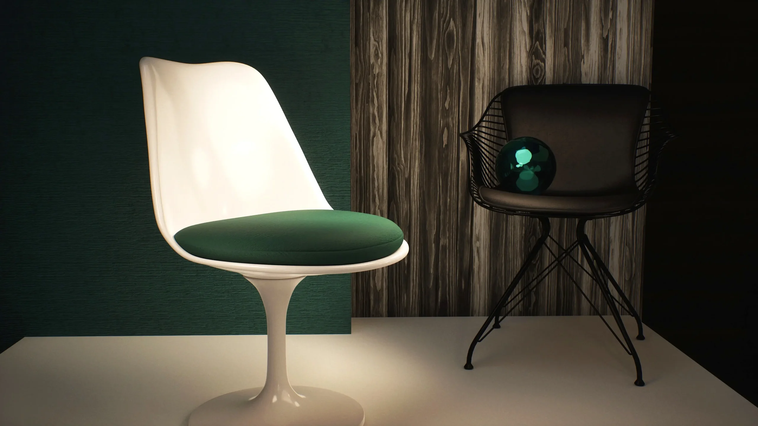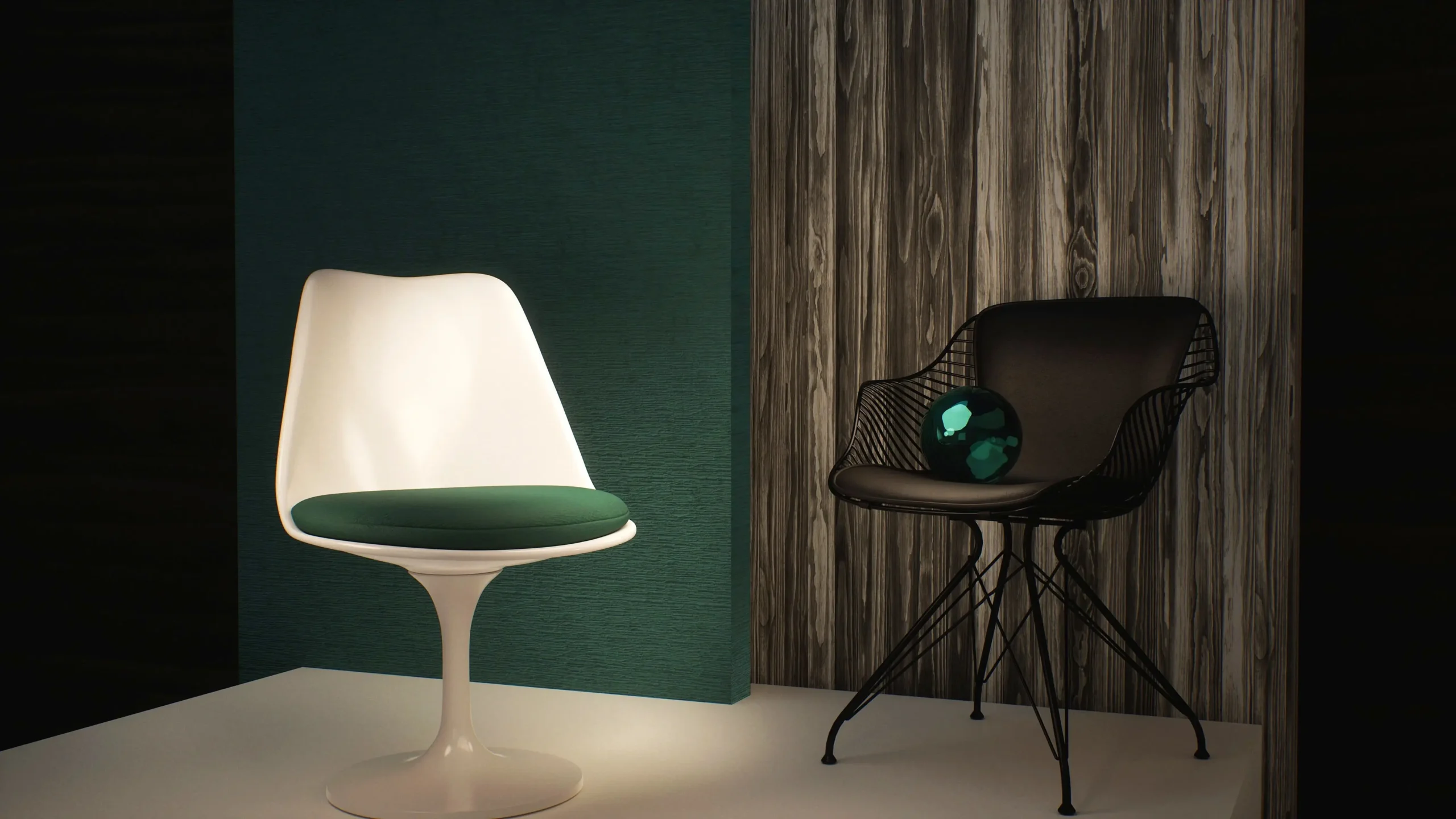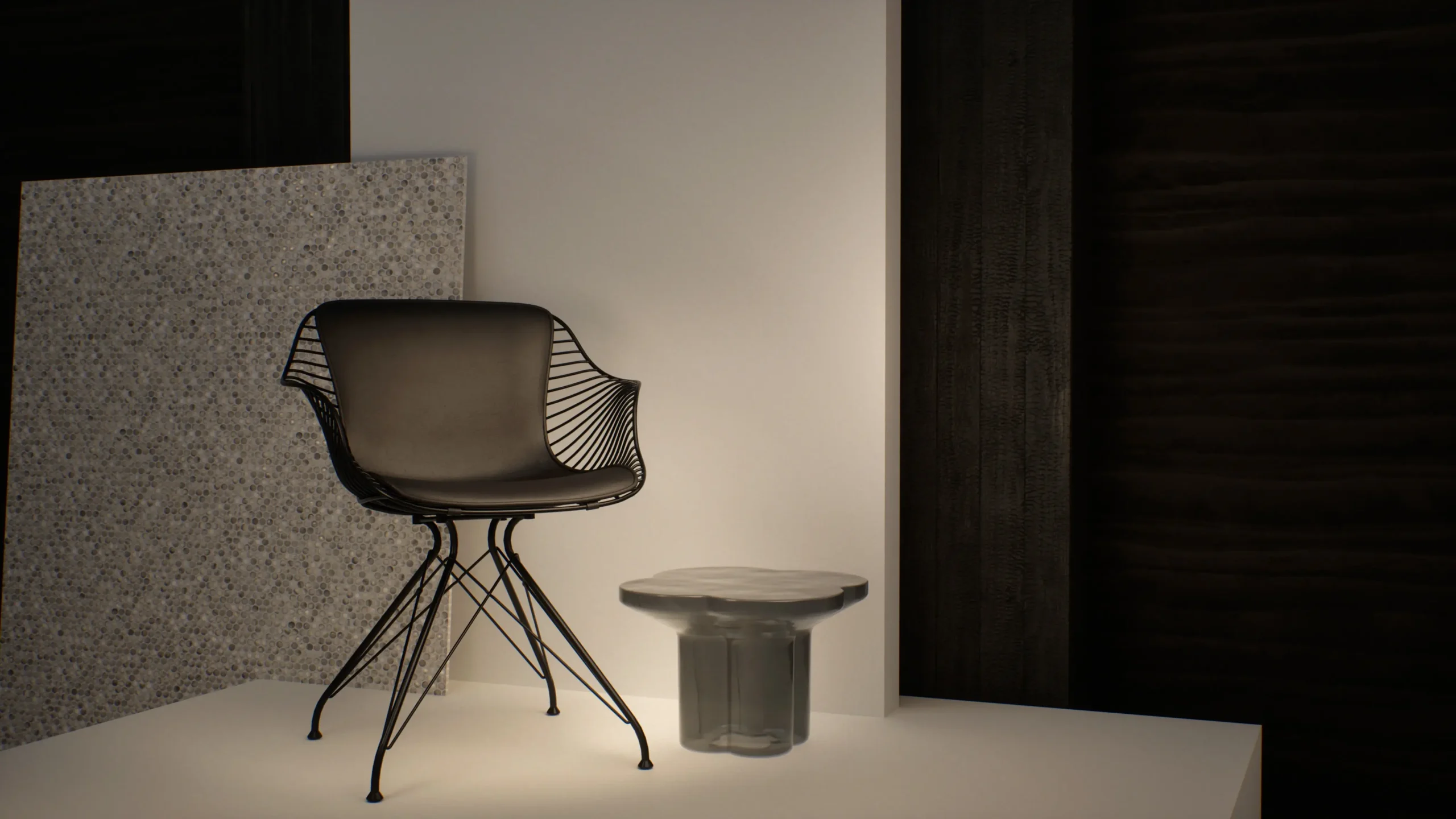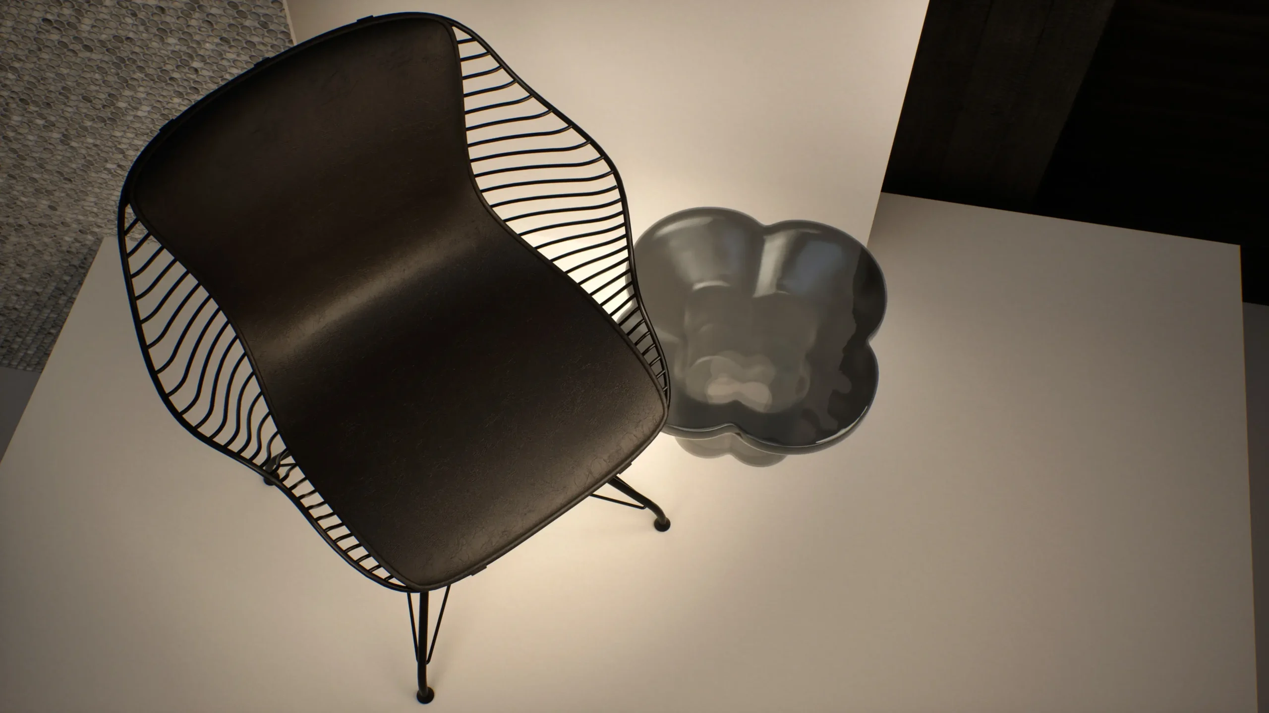 The environment was intentionally simplified to remove visual noise and allow the chair’s geometry and materials to remain the focal point. Each element from background surfaces to supporting objects was selected to reinforce contrast without distraction.